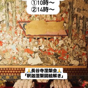 ☆3月15日(金)涅槃会☆「釈迦涅槃図」絵解き☆①10時から ②14時から☆長谷寺庫裏にて☆笛の生演奏と、やしょうまのお土産付き☆入場無料・予約不要☆どなたでもどうぞ 3月15日は、月遅れのお釈迦さまのご命日です。この日 […]